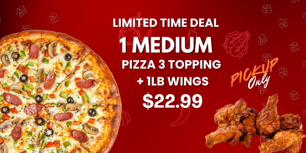 3 Great Pizzas 3 Toppings on each 2 lbs. of Chicken Wings 1 Garlic Bread w/ Cheese 1 Caesar Salad or 3 Dipping Sauces & 2L Pop Medium: $66.99 (730-1680/cals per serving) Large: $71.99 (830-1920/cals per serving) X-Large: $76.99 (850-1960/cals per serving)