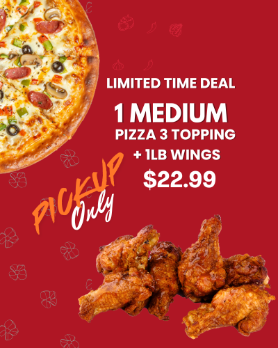 1 Great Pizza 3 Toppings 1 lb Chicken Wings 2 Bottles of Pop & 2 Dips Medium: $28.99 (680-1440/cals per serving) Large: $30.99 (710-1520/cals per serving) X-Large: $33.99 (780-1580/cals per serving)