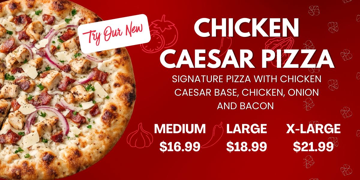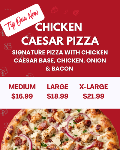 3 Great Pizzas 9 Combined Toppings 2 lbs. of Chicken Wings 1 Garlic Bread w/ Cheese 1 Caesar Salad or 3 Dipping Sauces & 2L Pop Medium: $60.99 (730-1680/cals per serving) Large: $65.99 (830-1920/cals per serving) X-Large: $70.99 (850-1960/cals per serving)