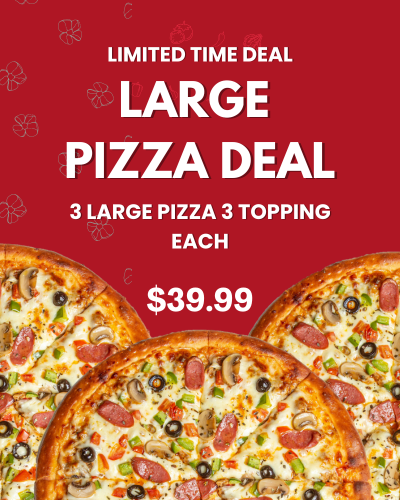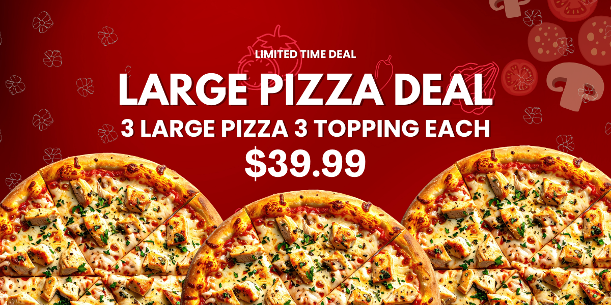 3 Great Pizzas 3 Toppings on each 2 lbs. of Chicken Wings 1 Garlic Bread w/ Cheese 1 Caesar Salad or 3 Dipping Sauces & 2L Pop Medium: $66.99 (730-1680/cals per serving) Large: $71.99 (830-1920/cals per serving) X-Large: $76.99 (850-1960/cals per serving)