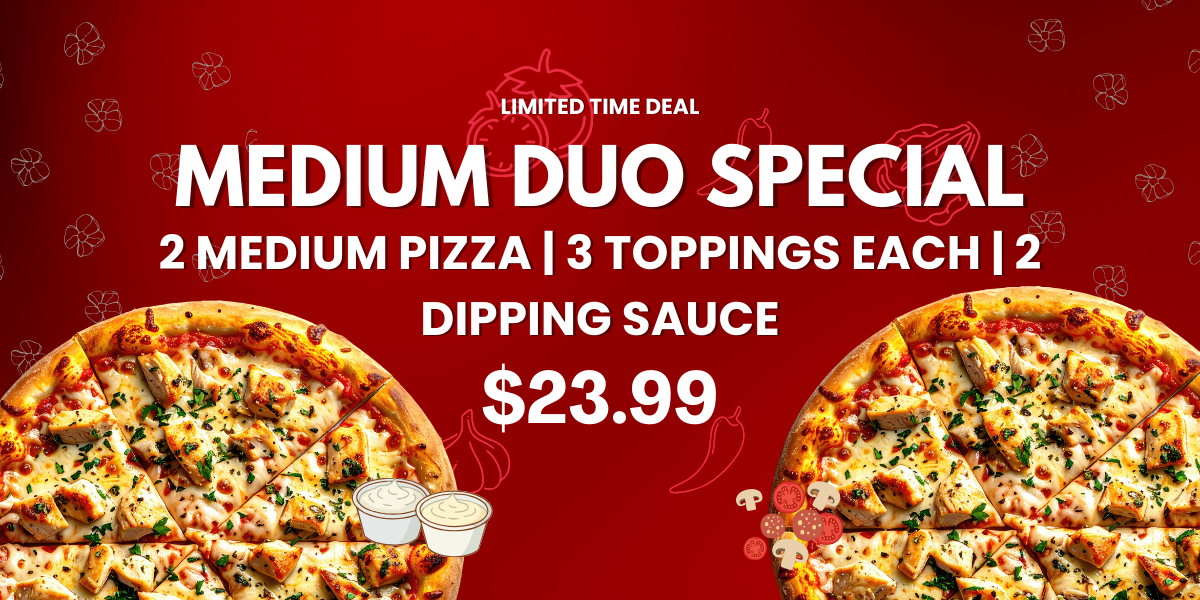2 Great Pizzas 3 Toppings on Each 2 lbs Chicken Wings 1 Garlic Bread w/ cheese 1 Caesar Salad or 2 Dipping Sauces 1 2L Pop Medium: $54.99 (730-1680/cals per serving) Large: $58.99 (830-1920/cals per serving) X-Large: $62.99 (850-1960/cals per serving)